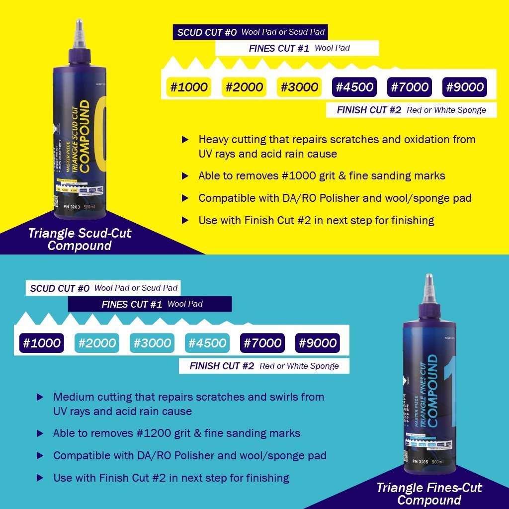 Scud-Cut Compound #0: Able to removes #1000 grit & fine sanding marks. Compatible with DA/RO Polisher and wool/sponge pad. Fines-Cut Compound #1: Able to removes #1200 grit & fine sanding marks. Compatible with DA/RO Polisher and wool/sponge pad. Finish-Cut Compound #2: Able to removes #2000 grit & fine sanding marks.