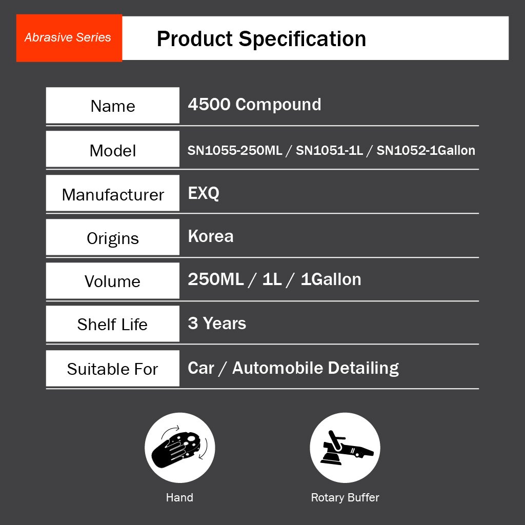 4500 Compound: Remove 2000 grit, sanding marks & water marks. Great removing scratches, swirls & holograms, water spots and sanding marks from the paint surface.