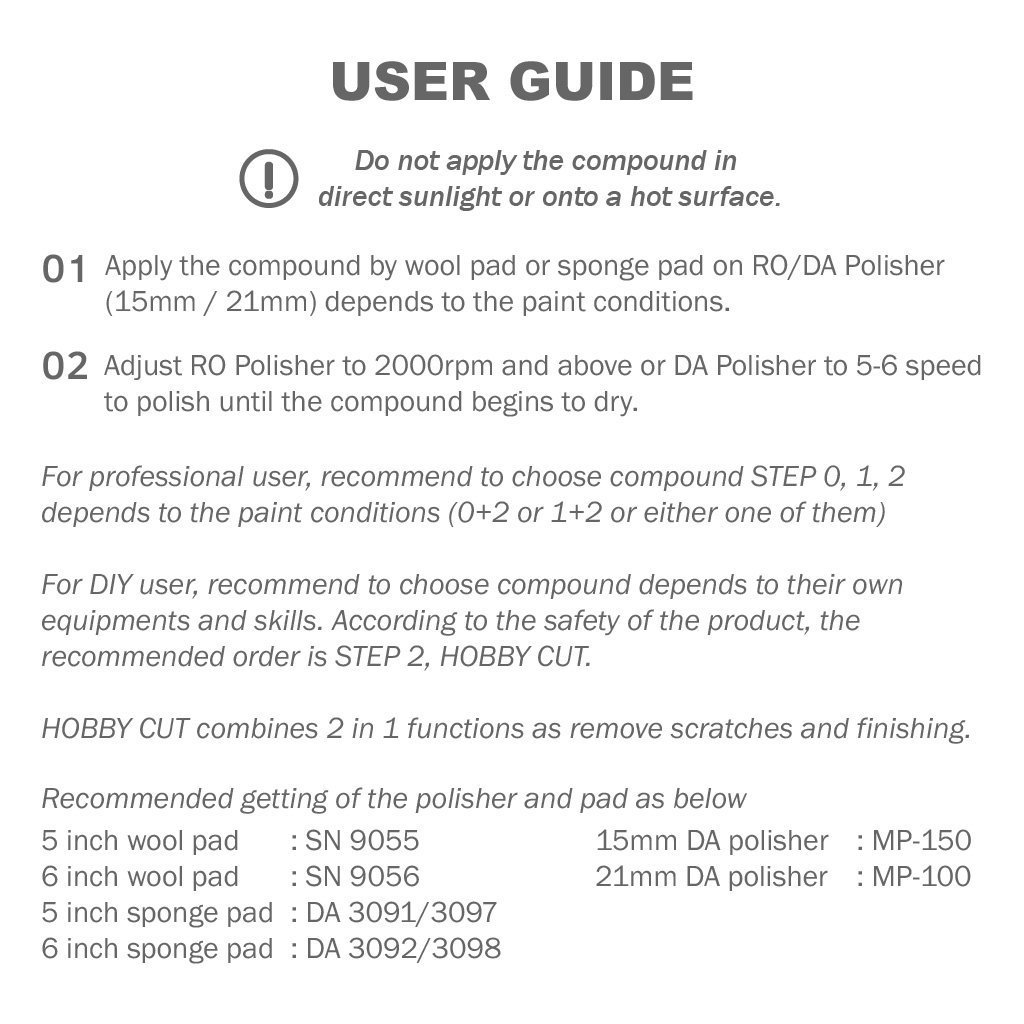 ALL IN ONE polish cutting that removes #3000 grit, light scratches and light swirls. Compatible with DA/RO polisher and wool/sponge pad. Water-based formula. One step polishing compound shown mirror effect. Excellent restorability 99% high gloss.